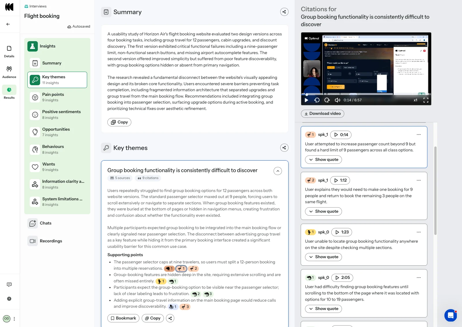 Example of live site testing recordings uploaded to Optimal Interviews for automated insights