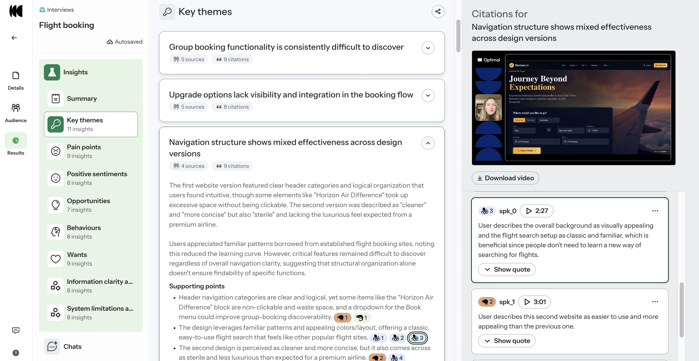 Each insight is backed by highlight reels and citations, allowing you to jump directly to the exact moment in the interview. Individual speakers are clearly identified to preserve context.